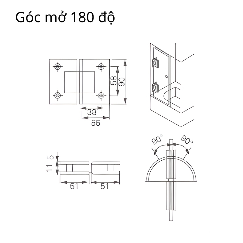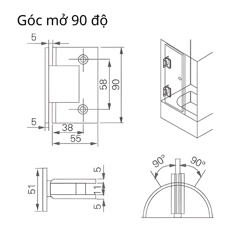 - 90°: Dùng cho kính liên kết với tường hoặc khung cố định.