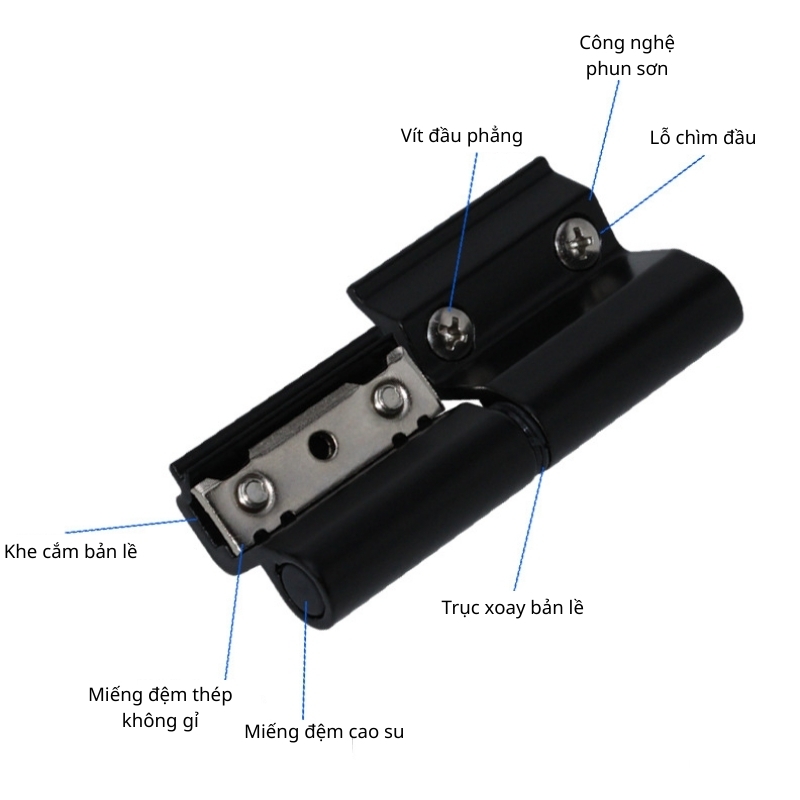 Bản lề sử dụng hợp kim nhôm cao cấp, bề mặt xử lý sơn tĩnh điện chống oxy hóa, hạn chế han gỉ, phù hợp lắp đặt cả trong nhà lẫn khu vực có độ ẩm cao. Cấu trúc bản lề tháo rời giúp việc thi công, bảo trì và thay thế cửa trở nên nhanh chóng, tiết kiệm thời gian và công sức.