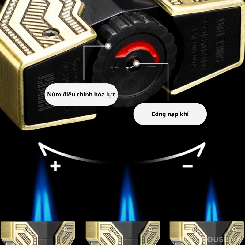 - Núm điều chỉnh ở đáy bật lửa giúp thay đổi kích thước ngọn lửa phù hợp với nhu cầu sử dụng