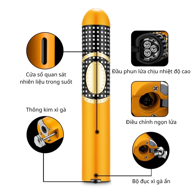 - Chức năng: bật lửa khò 3 tia + đục cigar + kim thông