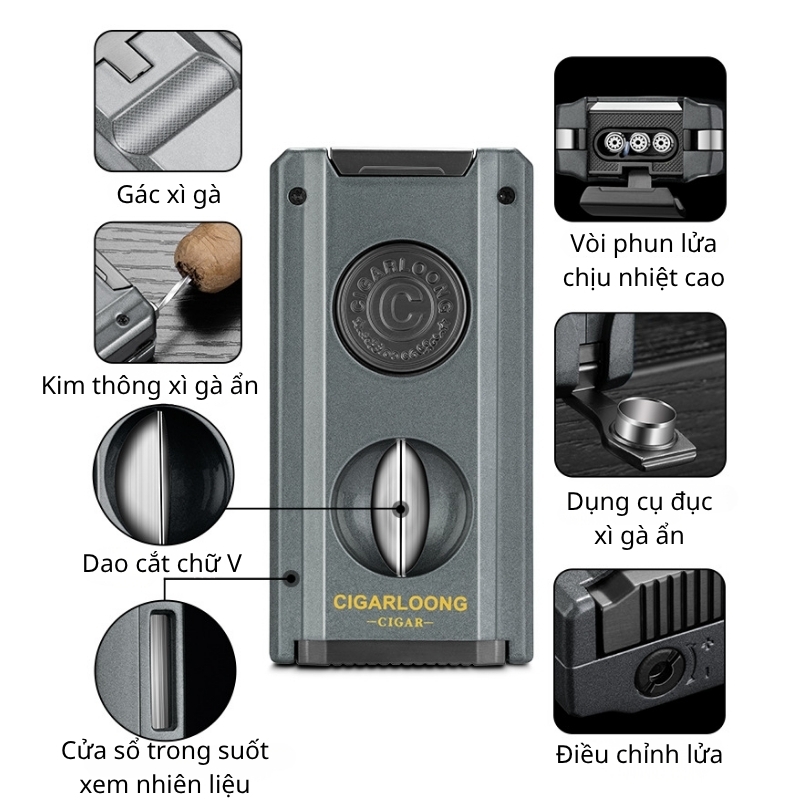 - Tích hợp đa chức năng tiện lợi: bao gồm bật lửa, dao cắt chữ V, kim thông và gác xì gà, đáp ứng đầy đủ nhu cầu sử dụng