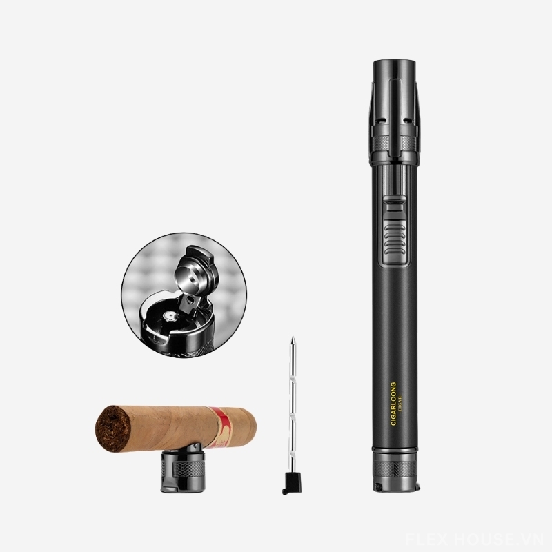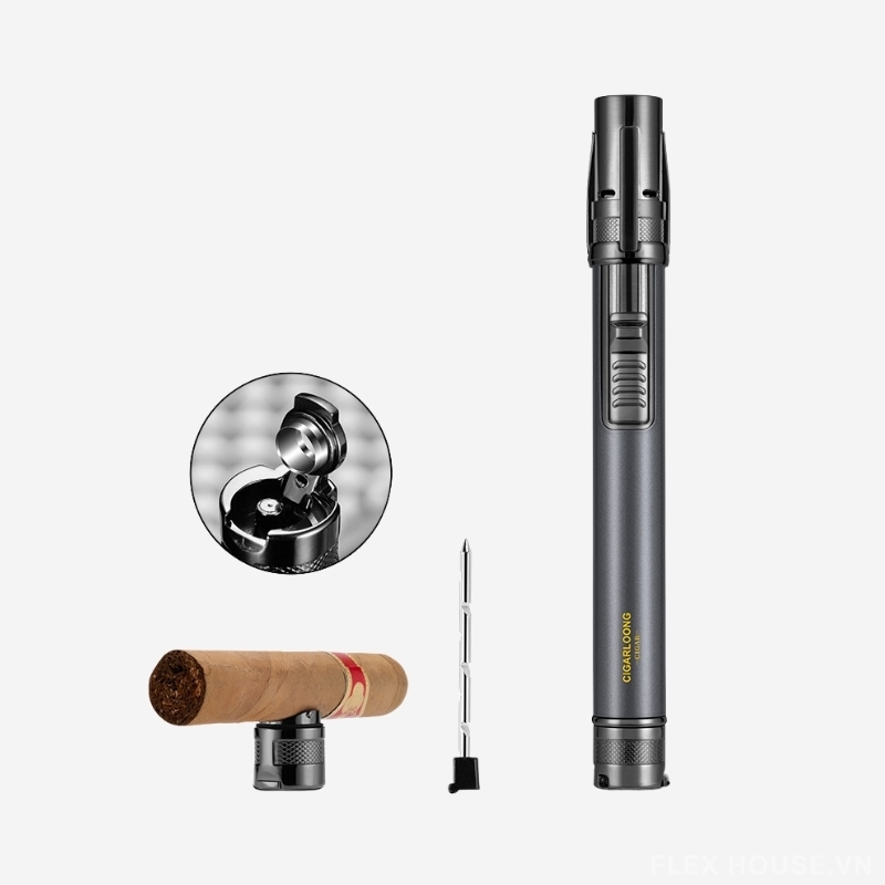 - Chức năng: Bật lửa khò + đục cigar + kim thông + đế gác cigar