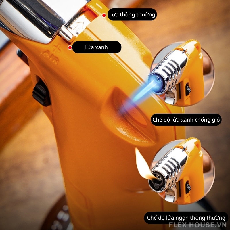 - Hai chế độ lửa linh hoạt cho phép chuyển đổi giữa lửa khò xanh chống gió và lửa thường tiện dụng