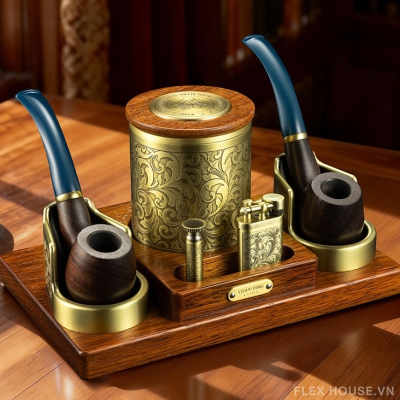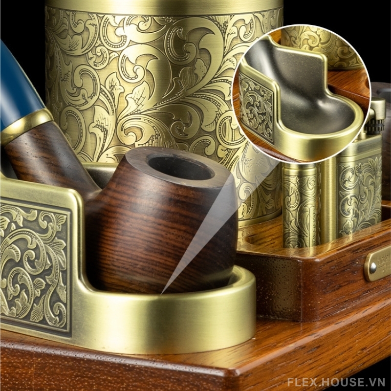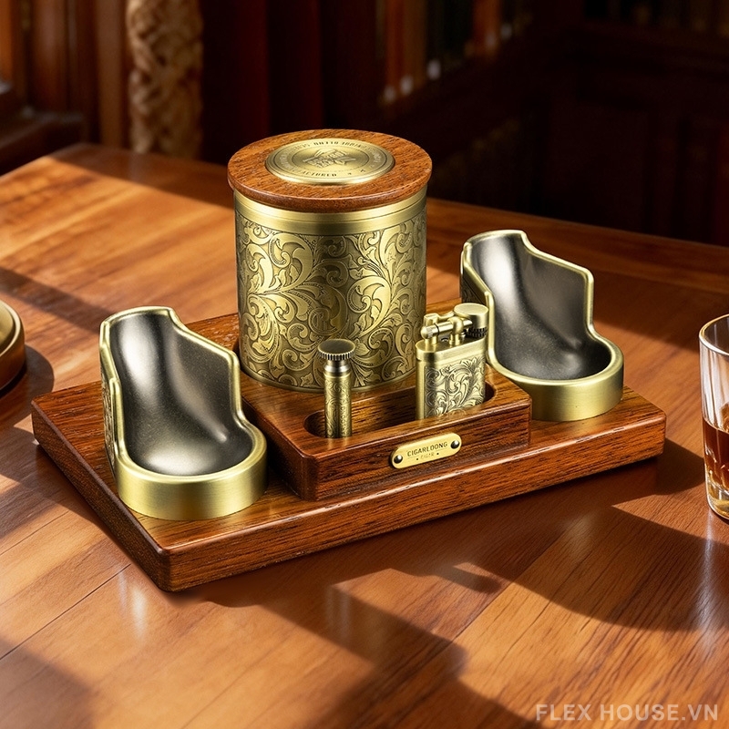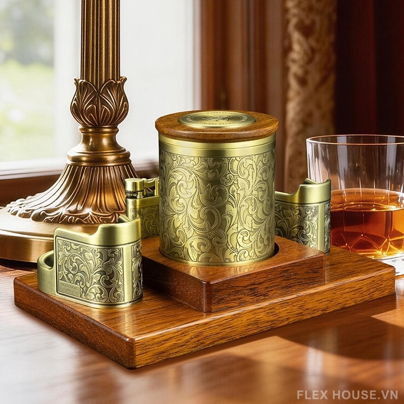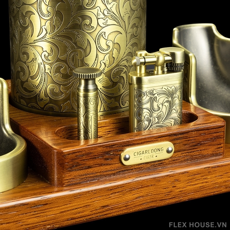 Bộ dụng cụ hút xì gà kiểu dáng cổ điển CGL5148 là set phụ kiện cao cấp dành cho người yêu phong cách hoài cổ và đề cao sự chỉn chu trong từng trải nghiệm. Thiết kế lấy cảm hứng từ nghệ thuật chạm khắc cổ điển phương Tây, kết hợp tông vàng đồng sang trọng và đế gỗ tự nhiên, tạo nên tổng thể đậm chất quý tộc, thích hợp đặt tại phòng khách, phòng làm việc hoặc cigar lounge.