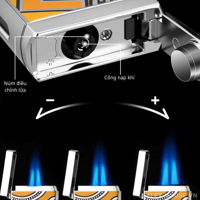 - Bật lửa được trang bị núm điều chỉnh giúp kiểm soát kích thước ngọn lửa phù hợp với nhu cầu sử dụng