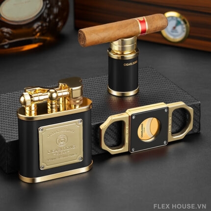 Bộ phụ kiện được chế tác từ hợp kim kẽm cao cấp với lớp mạ kim loại tinh xảo, tạo nên vẻ ngoài mạnh mẽ và đẳng cấp. Thiết kế đồng bộ với tông màu vàng – đen sang trọng, đi kèm hộp quà cao cấp, giúp bộ phụ kiện không chỉ phục vụ nhu cầu sử dụng cá nhân mà còn là món quà ý nghĩa dành cho những người yêu cigar.