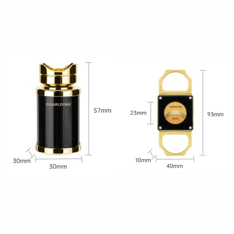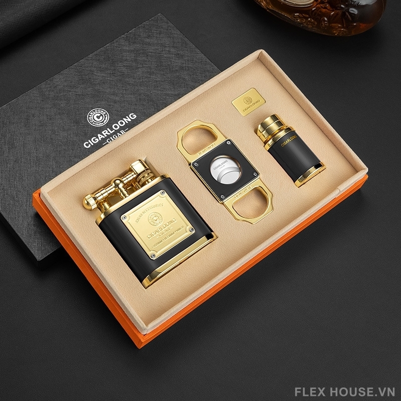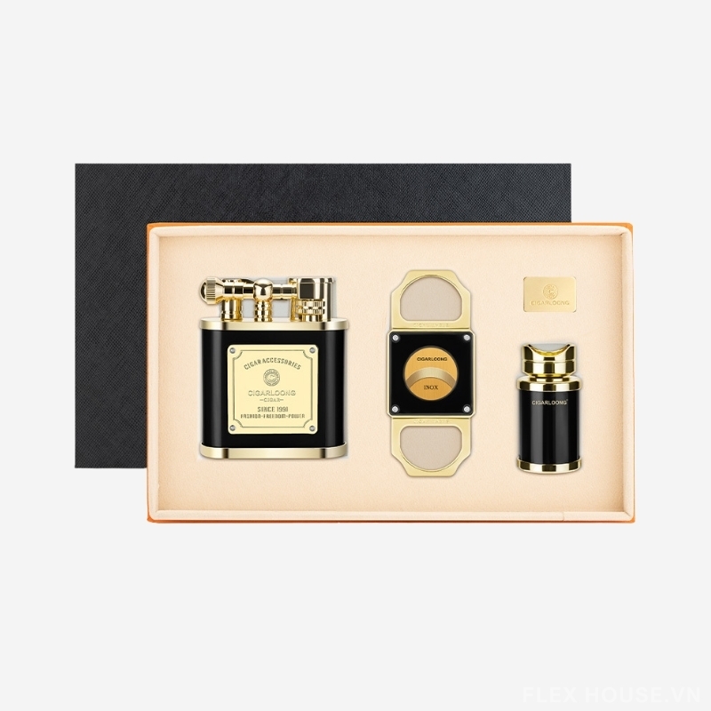 Bộ phụ kiện được chế tác từ hợp kim kẽm cao cấp với lớp mạ kim loại tinh xảo, tạo nên vẻ ngoài mạnh mẽ và đẳng cấp. Thiết kế đồng bộ với tông màu vàng – đen sang trọng, đi kèm hộp quà cao cấp, giúp bộ phụ kiện không chỉ phục vụ nhu cầu sử dụng cá nhân mà còn là món quà ý nghĩa dành cho những người yêu cigar.