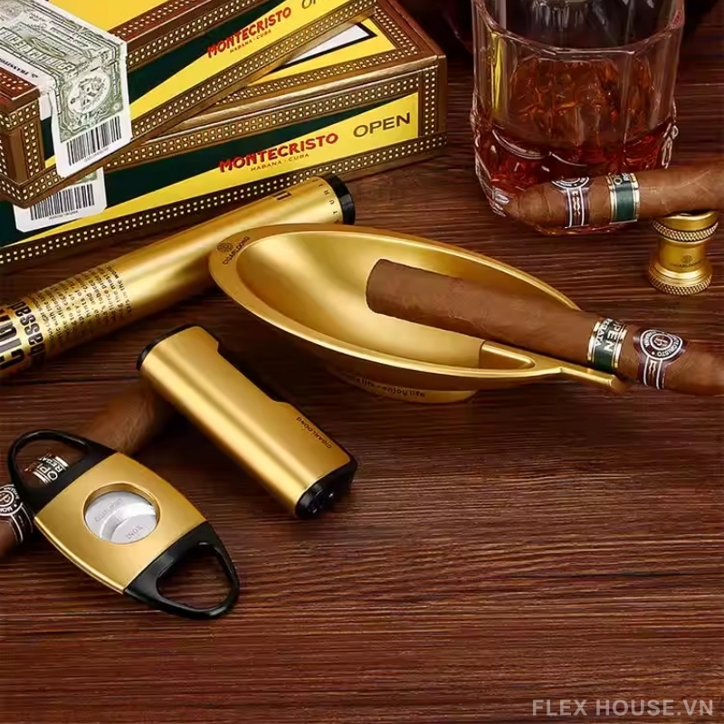 - Bộ phụ kiện sở hữu tông màu vàng kim loại cao cấp, mang phong cách lịch lãm và tinh tế, phù hợp với không gian phòng làm việc, phòng khách hoặc phòng cigar