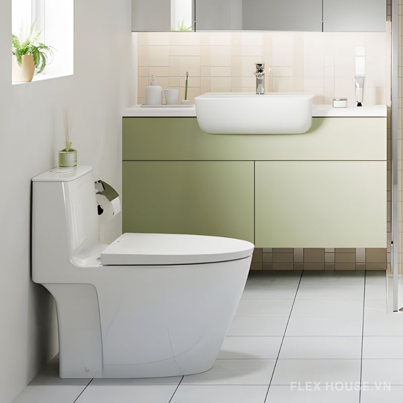 - Kiểu dáng liền khối hiện đại, két nước và bệ ngồi liền mạch