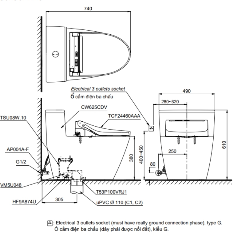 Giới thiệu Bồn cầu 1 khối nắp rửa điện tử xả nhấn TOTO MS625CDW15