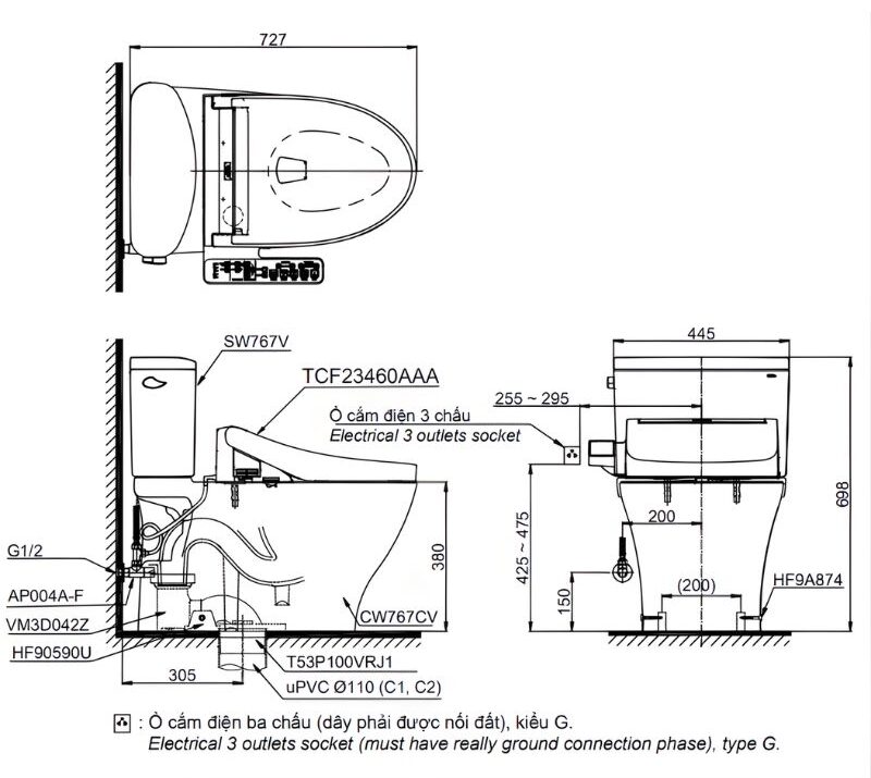 Đặc điểm Bồn cầu 2 khối nắp rửa điện tử giấu dây TOTO CS767CRW17