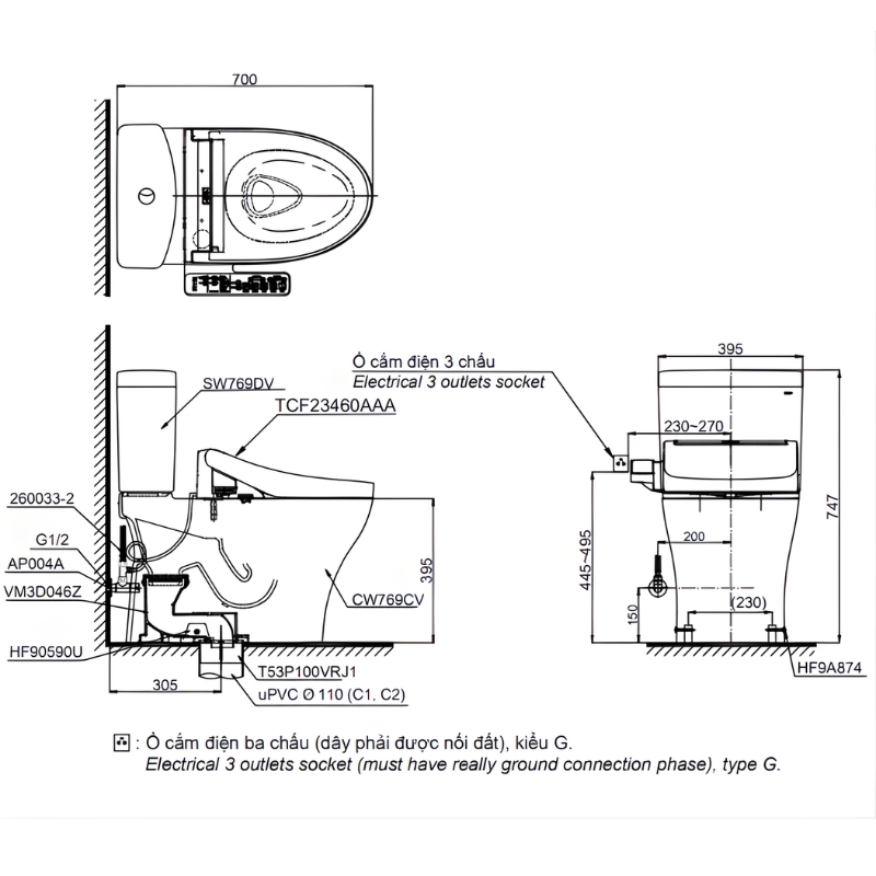 Đặt mua Bồn cầu 2 khối nắp rửa điện tử giấu dây TOTO CS769CDRW17