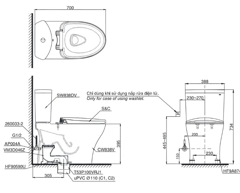 Đặc điểm Bồn cầu 2 khối nắp rửa điện tử giấu dây TOTO CS838CDW23