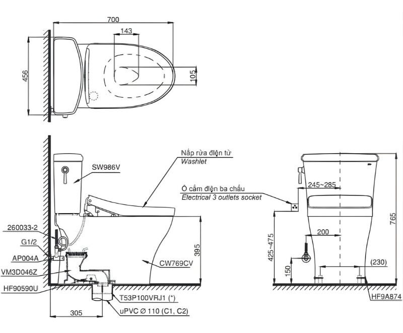 Đặt mua Bồn cầu 2 khối nắp rửa điện tử Washlet giấu dây TOTO CS986CGW23