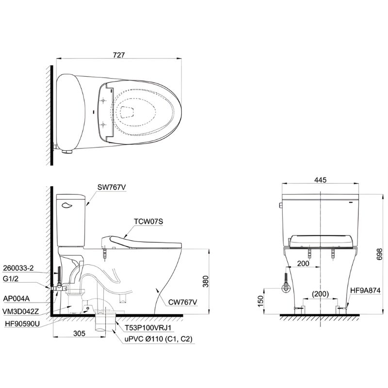 - Nắp đóng êm kèm vòi rửa nước lạnh TCW07S, hạn chế tiếng ồn, tránh sứt mẻ, tăng tuổi thọ sản phẩm