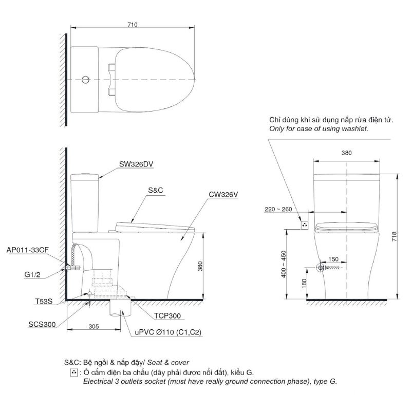Giới thiệu Bồn cầu 2 khối xả nhấn nắp rửa điện tử TOTO CS326DW14