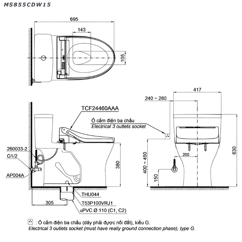 Đặc điểm Bồn cầu men sứ xả xoáy nắp điện tử liền khối TOTO MS855CDW15