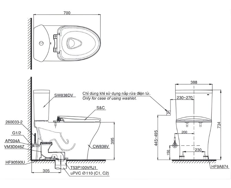 - Hệ thống xả TORNADO 3 cửa siêu mạnh, siêu êm, tiết kiệm nước 4.5/3L