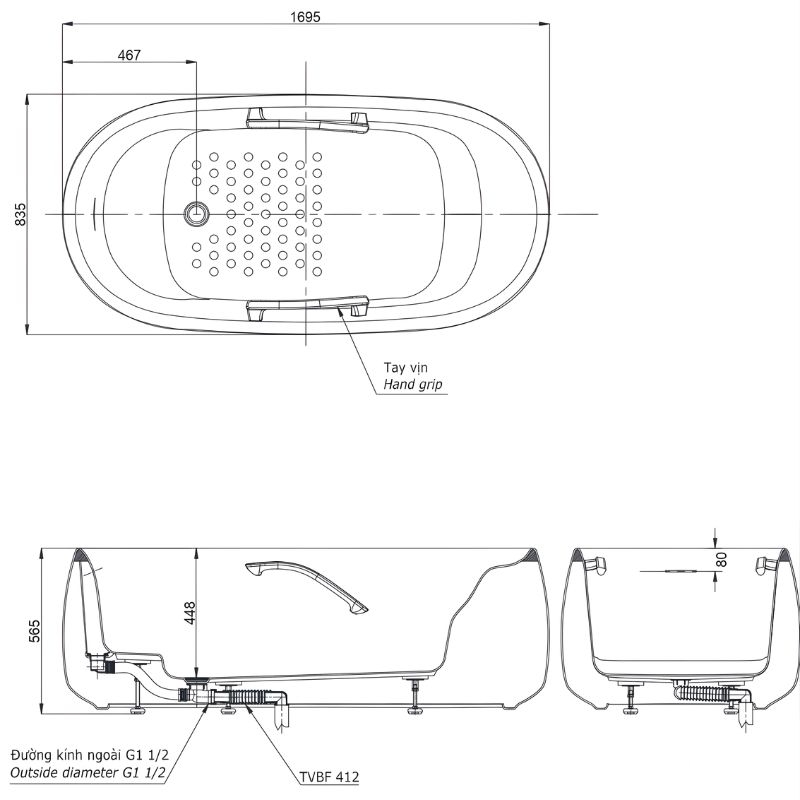 - Đã bao gồm thanh tay vịn, bộ xả nhấn, ống thoát thải bồn tắm (TVBF412)
