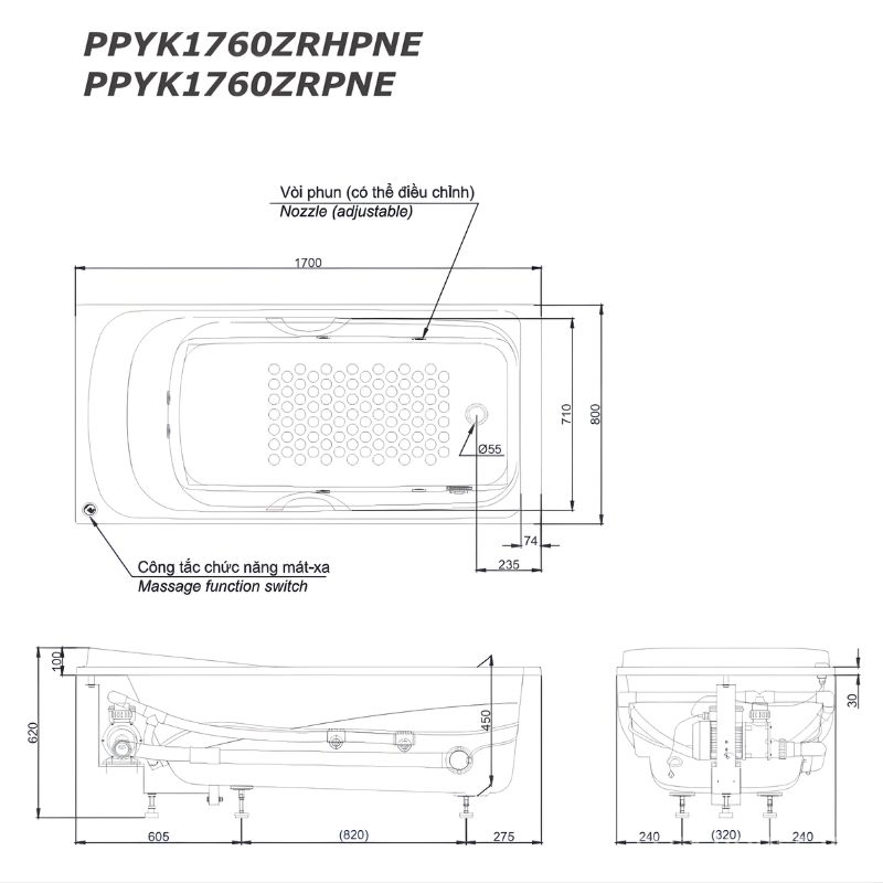 Bồn tắm xây TOTO PPYK1760ZRHPNE được làm từ nhựa Acrylic cao cấp, bền đẹp, dễ vệ sinh. Kích thước chiều dài 1m7 cùng với dung tích 256L bồn tắm giúp người dùng có không gian thư giãn, ngâm bồn thoải mái. Bồn tắm còn tích hợp tay vịn chắc chắn và hai chế độ massage hiện đại: xoáy nước (Whirlpool) và sục khí (Air Bubble), mang đến trải nghiệm tắm tiện nghi, thư giãn và thời thượng. Sản phẩm đã bao gồm ống thoát thải bồn tắm, giúp việc lắp đặt trở nên thuận tiện và dễ dàng hơn.