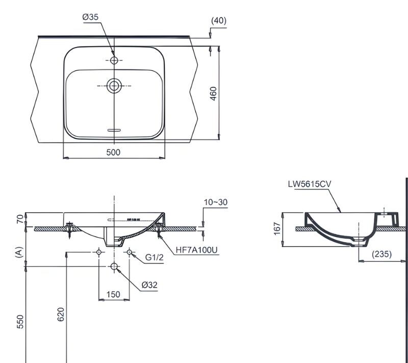 - Thiết kế lỗ bắt vòi trên bàn Ø35 mm