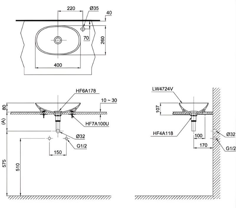 - Lỗ bắt vòi trên bàn, kích thước Ø35 mm