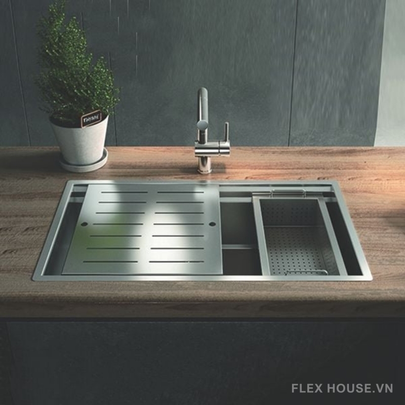 1. Đa năng, tiện nghi: Nhờ gờ trượt phụ kiện thông minh, chậu Zeus có thể biến thành bàn sơ chế linh hoạt, giúp tiết kiệm diện tích và tối ưu công năng khu vực rửa.