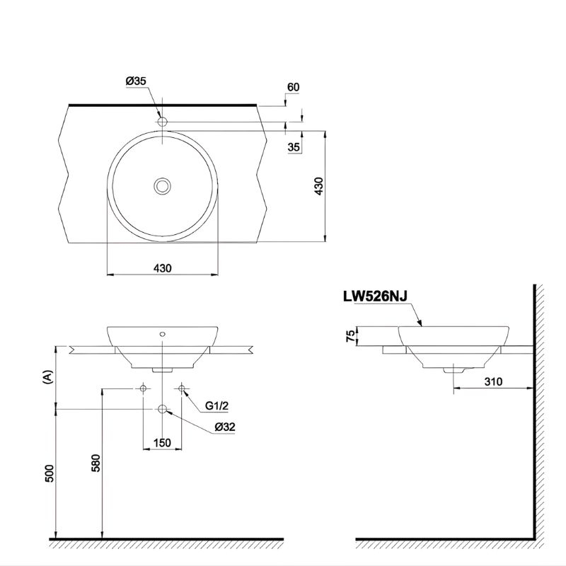 - Lỗ bắt vòi trên bàn, kích thước Ø35 mm