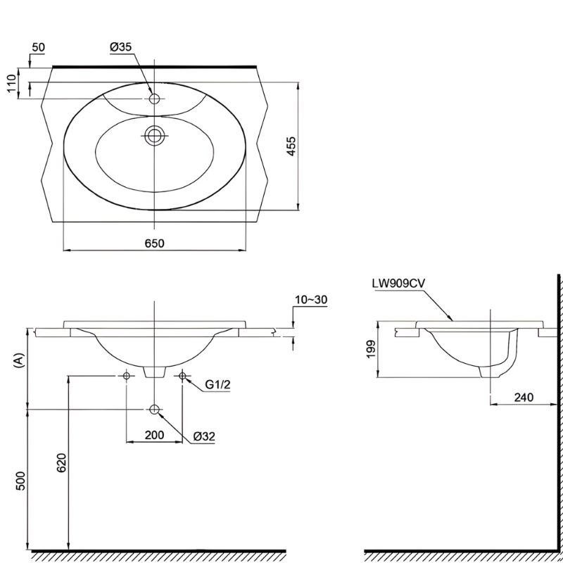 - Lỗ bắt vòi trên bàn, kích thước Ø35 mm