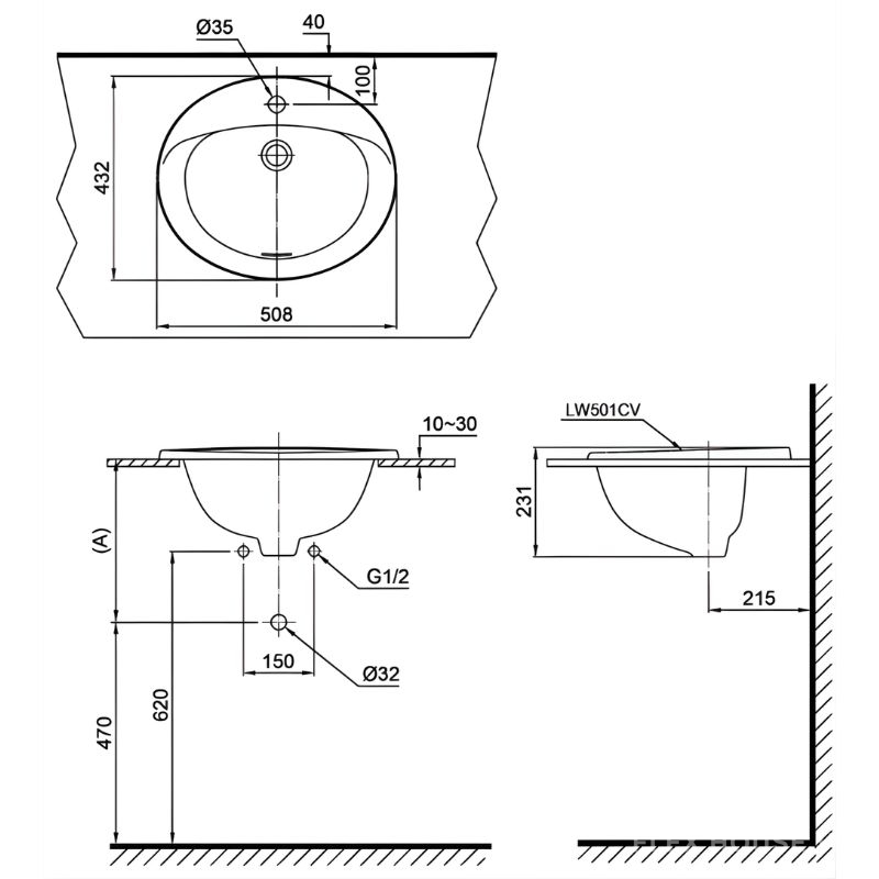 - Lỗ bắt vòi trên bàn, kích thước Ø35 mm