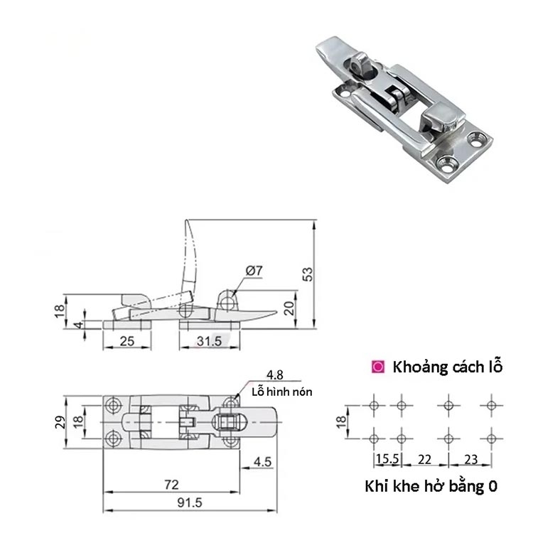Sản phẩm chốt khóa được chế tạo từ thép không gỉ 316 cao cấp, nổi bật với khả năng chống ăn mòn và chống gỉ sét vượt trội, đặc biệt phù hợp cho môi trường ẩm ướt hoặc ngoài trời. Bề mặt đánh bóng gương sáng đẹp, không chỉ tăng tính thẩm mỹ mà còn giúp dễ vệ sinh và giữ độ bền lâu dài theo thời gian.