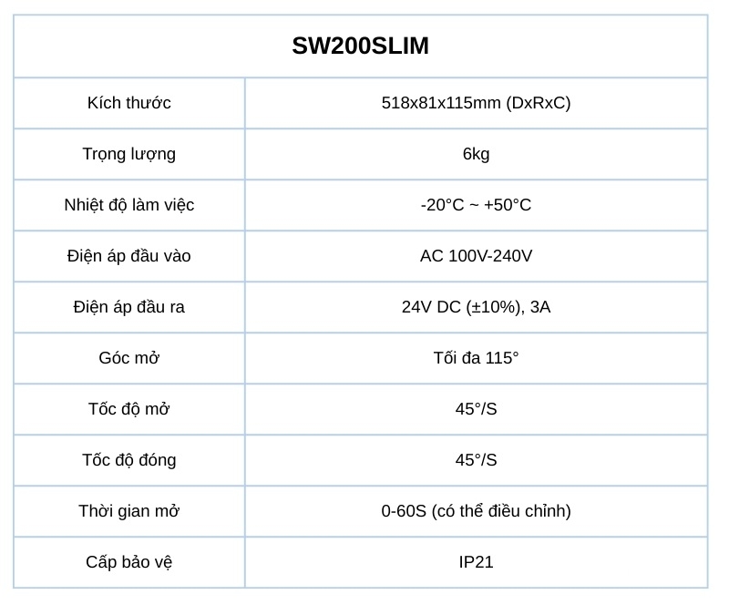 Thời gian giữ mở tối đa 60 giây cùng khả năng chọn trục dài theo từng độ dày khung cửa khiến SW200SLIM trở thành lựa chọn lý tưởng cho các công trình đòi hỏi sự linh hoạt, độ bền và tính an toàn tuyệt đối. Đây là hệ tay đòn tự động mà các đơn vị chuyên nghiệp thường ưu tiên khi cần mức vận hành ổn định và bảo trì thấp lâu dài.