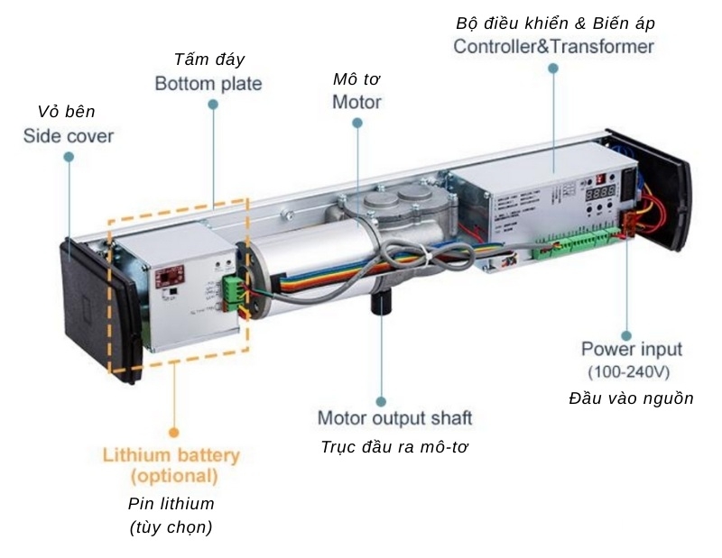 - Trục đầu ra mô-tơ (Motor Output Shaft): Truyền lực chính để kéo – đẩy cánh cửa.