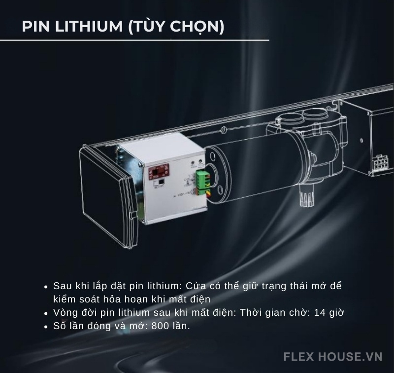 - Pin lithium tùy chọn, khi mất điện, cửa có thể giữ mở (để thoát hiểm) hoặc tiếp tục vận hành theo chế độ an toàn. Thời gian chờ pin lên đến 14 giờ, đóng mở được 800 lần.