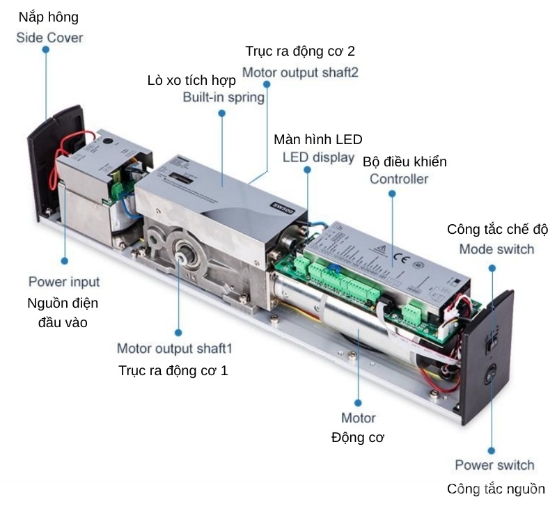 - Màn hình LED hiển thị 30+ thông số cài đặt, kỹ thuật viên có thể tinh chỉnh tốc độ, lực đóng/mở, cảm biến, hướng mở… một cách chính xác.