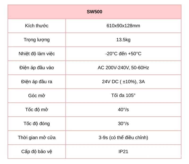 Như vậy, với thiết kế lò xo tích hợp, động cơ mạnh mẽ và khả năng vận hành an toàn theo chuẩn EN16005, SW500 đáp ứng hoàn hảo nhu cầu cho cửa mở cánh tự động trong các công trình hiện đại. Từ cửa chống cháy, lối đi bệnh viện đến văn phòng và khu thương mại, SW500 luôn đảm bảo độ bền, sự ổn định và trải nghiệm sử dụng mượt mà.