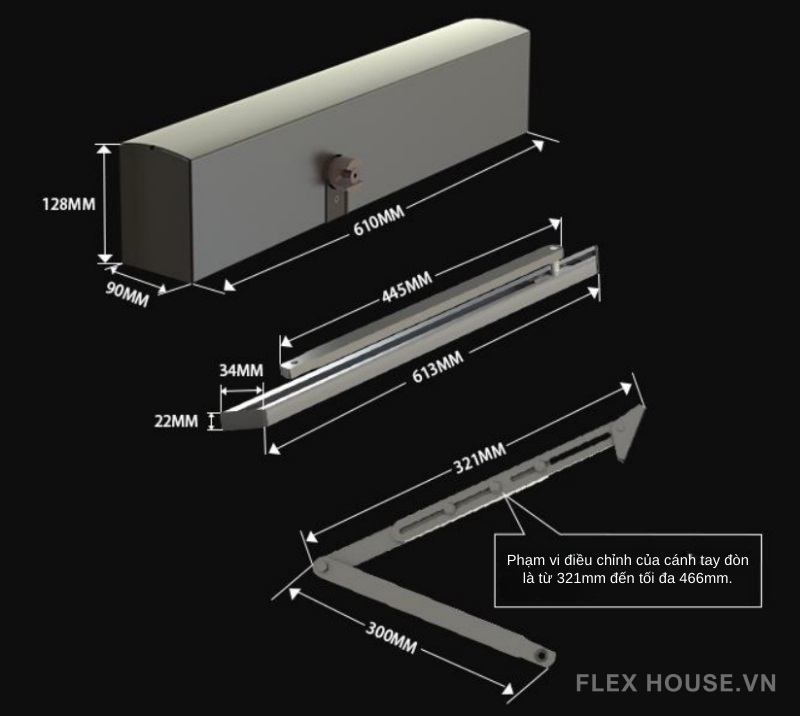 - Kích thước tổng thể: 610×90×128 mm, gọn gàng, dễ lắp đặt cho nhiều loại khung cửa khác nhau.