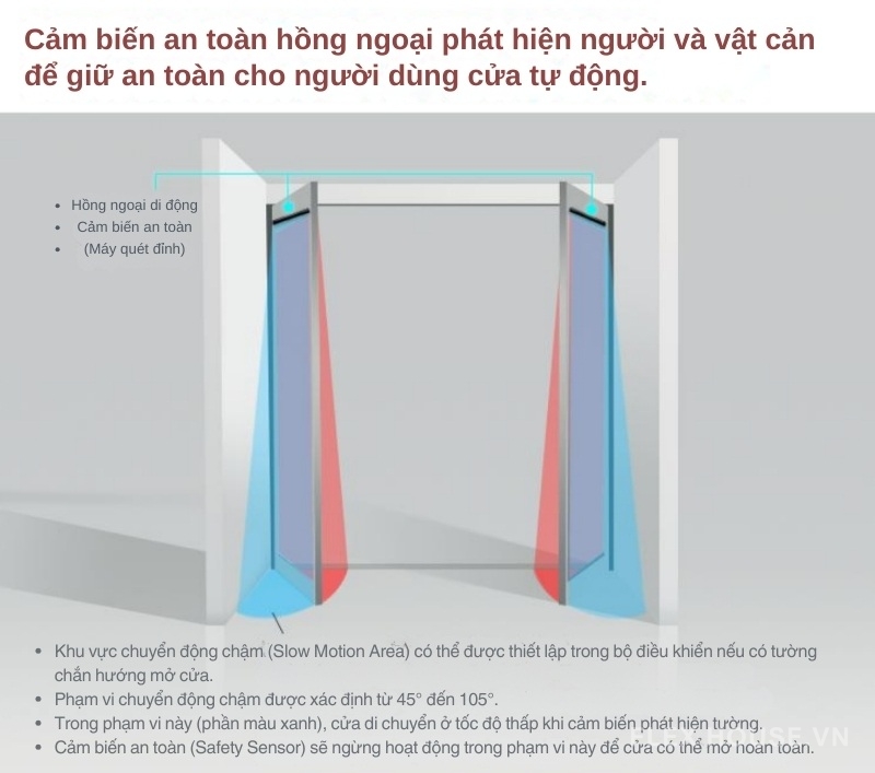 - Thời gian giữ mở cửa: 3–9 giây, điều chỉnh được theo nhu cầu sử dụng thực tế.