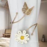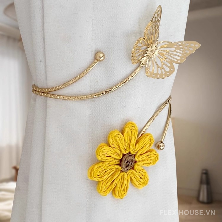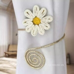 Dây kim loại buộc rèm FSH784 là điểm nhấn decor đầy nghệ thuật, kết hợp giữa khung kim loại mạ vàng sang trọng và bông hoa cúc handmade mang vẻ đẹp tự nhiên, mềm mại. Thiết kế vòng uốn tinh tế giúp cố định rèm chắc chắn, đồng thời tạo hiệu ứng thẩm mỹ nhẹ nhàng, phù hợp với mọi phong cách nội thất từ hiện đại đến vintage.