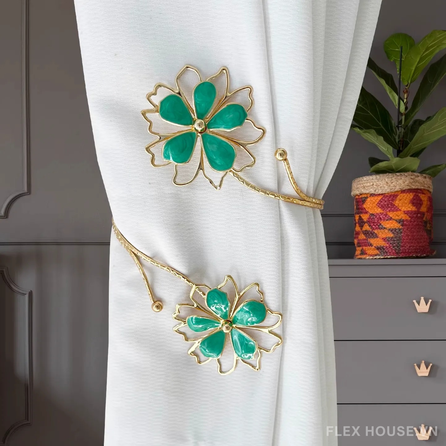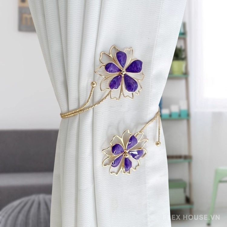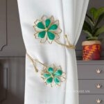 Dây kim loại buộc rèm đính hoa trang trí FSH460 là phụ kiện decor sang trọng, mang phong cách nghệ thuật mềm mại và đầy tinh tế. Thiết kế nổi bật với bông hoa 6 cánh được đính đá và phủ màu ngọc trong trẻo, tạo hiệu ứng ánh sáng lung linh khi đặt cạnh rèm. Khung hoa được làm từ kim loại mạ vàng, uốn cong tinh xảo, vừa tạo độ bền vừa tăng tính thẩm mỹ cho sản phẩm.