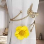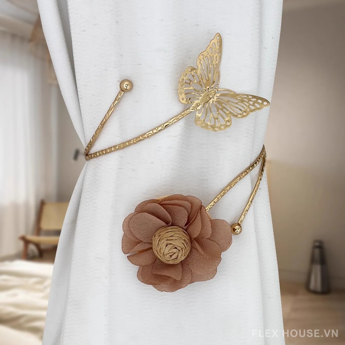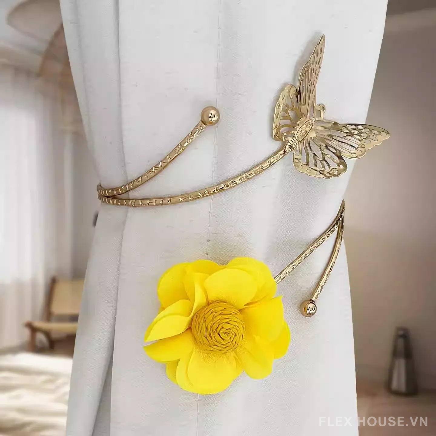Sản phẩm mang phong cách trang nhã, dễ dàng phối hợp với nhiều chất liệu và màu sắc rèm khác nhau. Chất liệu kim loại chắc chắn giúp cố định rèm gọn gàng, trong khi phần hoa và bướm mang lại cảm giác mềm mại, lãng mạn.