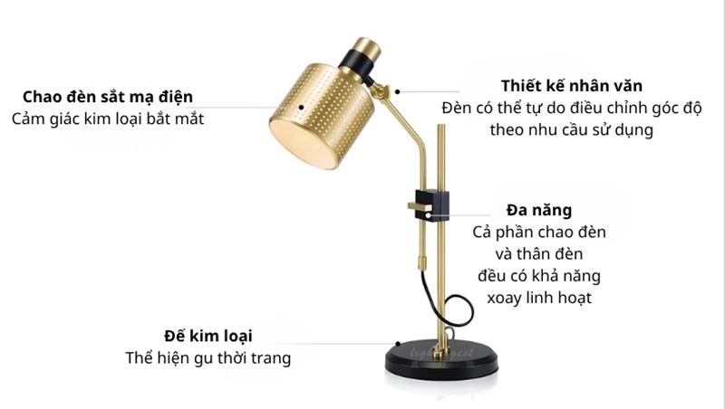 - Điều chỉnh linh hoạt, có thể tự do thay đổi góc chiếu của chao đèn theo nhu cầu sử dụng