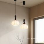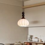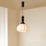 Hình dáng cong mềm mại kết hợp với đường nét thanh thoát của gỗ nguyên khối, tạo nên một tác phẩm nghệ thuật thả trần đặc biệt. Ánh sáng dịu nhẹ xuyên qua lớp lụa thủ công mang đến không gian ấm áp, biến không gian xung quanh thành buổi triển lãm ánh sáng đầy cảm xúc.