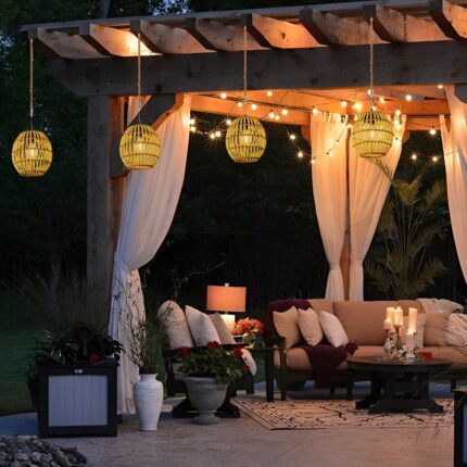 Đèn thả đan mây nghệ thuật decor sân vườn FX7267 là loại đèn đan bằng cao su thủ công với vẻ ngoài đẹp và tinh tế, có thể sử dụng trong nhà và ngoài trời. Sử dụng nguồn sáng đèn LED giúp ánh sáng rực rỡ chiếu sáng sân hiên của bạn theo một cách đặc biệt, mang lại bầu không khí nhẹ nhàng và lãng mạn cho khu vườn của bạn. Đèn treo ngoài trời sử dụng kết nối điện và pin năng lượng mặt trời cho bạn lựa chọn thích hợp.