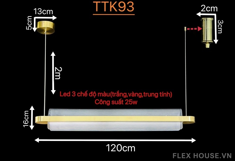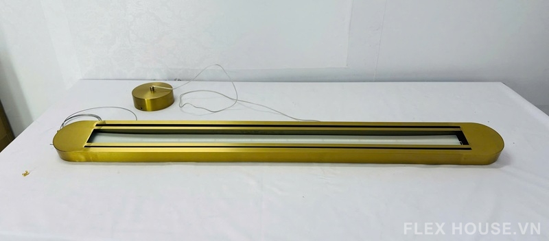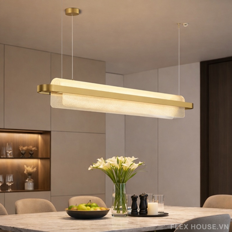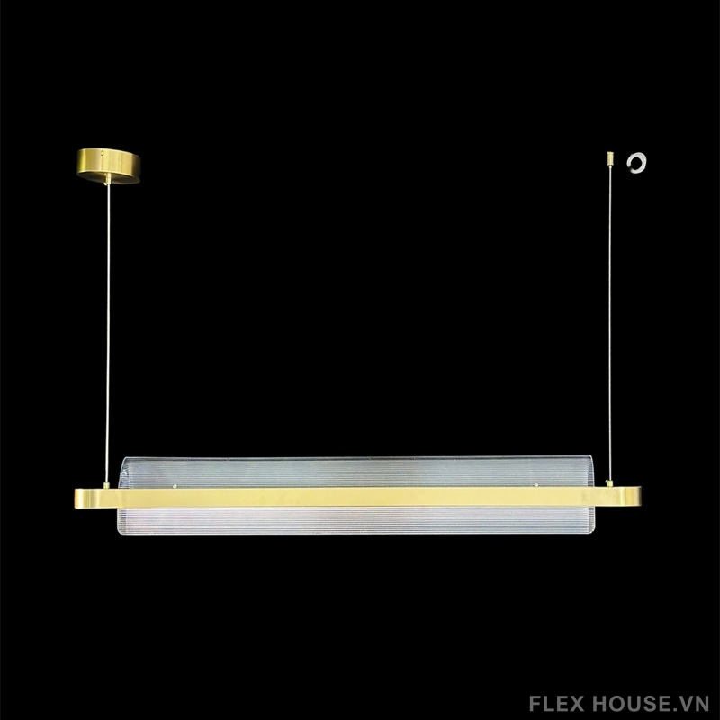 Đèn thả trần TTK93 gây ấn tượng mạnh với thiết kế thanh dài hiện đại, khung kim loại mảnh gọn phủ màu vàng ánh kim sang trọng, kết hợp chao kính mờ tinh tế. Tổng thể mang tinh thần Modern Minimalism, tối giản nhưng có chiều sâu thẩm mỹ, đặc biệt phù hợp với các không gian cần sự gọn gàng, cao cấp và ánh sáng dịu mắt.