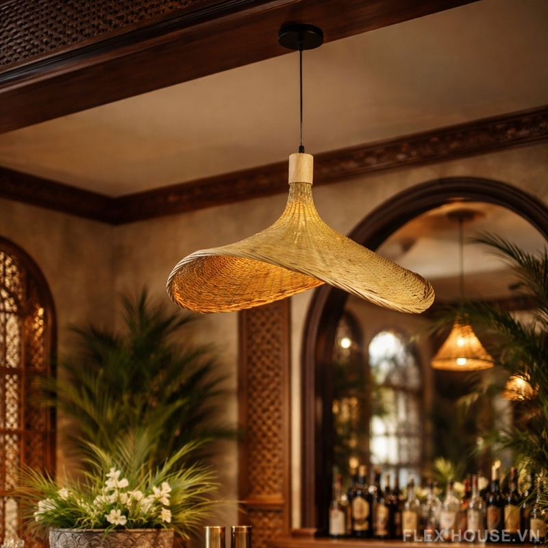 Lấy cảm hứng từ dòng chảy thẩm mỹ Indochine, Đèn thả quán cafe TTK200 gợi lên hình ảnh những không gian Á Đông xưa cũ, nơi ánh sáng không chỉ để chiếu rọi mà còn kể câu chuyện về văn hóa và ký ức. Dáng đèn uốn lượn mềm mại như một chuyển động chậm rãi của gió nhiệt đới, kết hợp kỹ thuật đan thủ công tạo nên cảm giác mộc mạc, tự nhiên nhưng đầy tính điêu khắc – một điểm nhấn nghệ thuật treo lơ lửng giữa không gian.