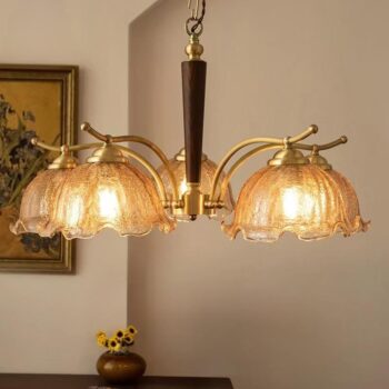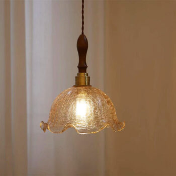 Đèn thả trần đồng thau trụ gỗ sang trọng có khung đèn bằng đồng thau cao cấp, trụ đèn bằng gỗ sang trọng, chao đèn thủy tinh rạn tạo hình bông hoa rũ xuống độc đáo, ấn tượng.