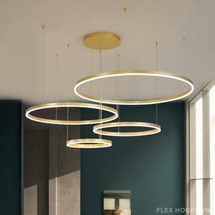 Đèn thả trần THD7046 gây ấn tượng mạnh với thiết kế vòng tròn đa tầng xếp lớp tự do, tạo cảm giác chuyển động mềm mại trong không gian. Các vòng sáng đồng tâm mang tinh thần Modern Luxury pha chút Art Decor đương đại, vừa tối giản hình khối vừa sang trọng nhờ lớp xi vàng ánh kim tinh tế.