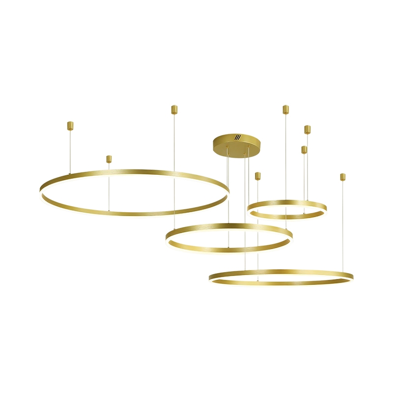 Đèn thả trần THD7046 gây ấn tượng mạnh với thiết kế vòng tròn đa tầng xếp lớp tự do, tạo cảm giác chuyển động mềm mại trong không gian. Các vòng sáng đồng tâm mang tinh thần Modern Luxury pha chút Art Decor đương đại, vừa tối giản hình khối vừa sang trọng nhờ lớp xi vàng ánh kim tinh tế.