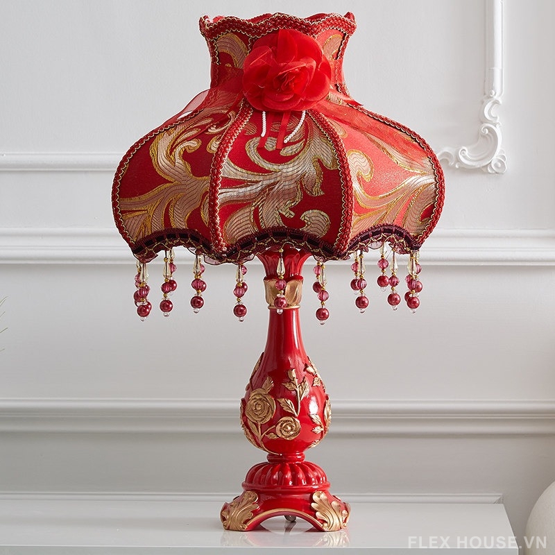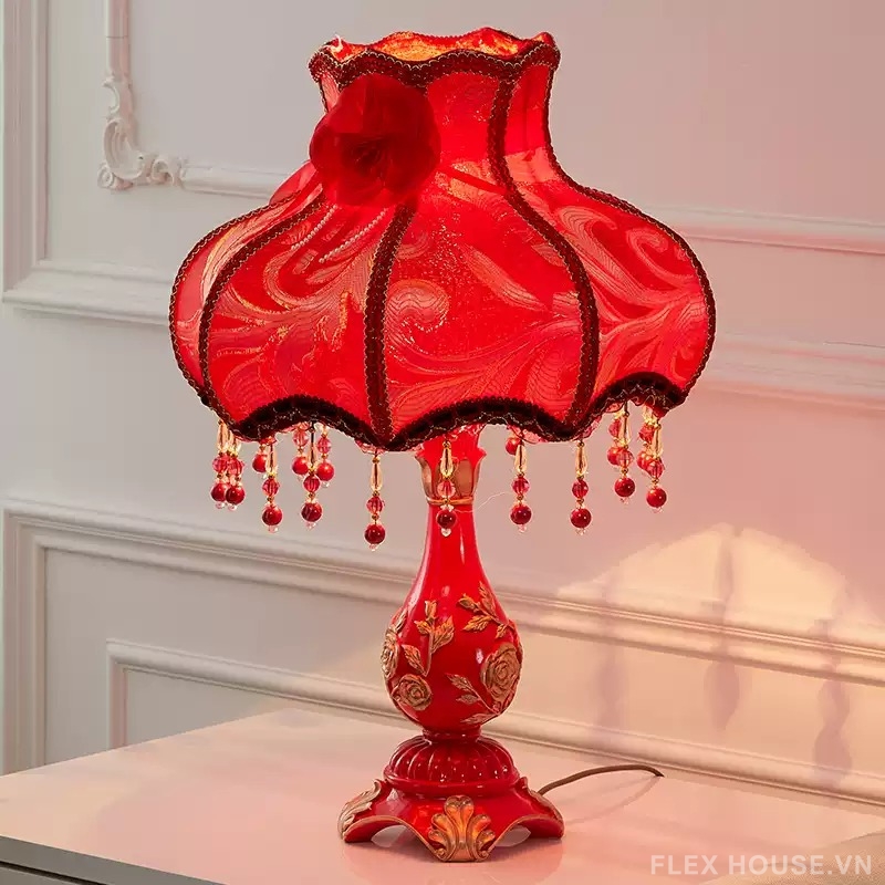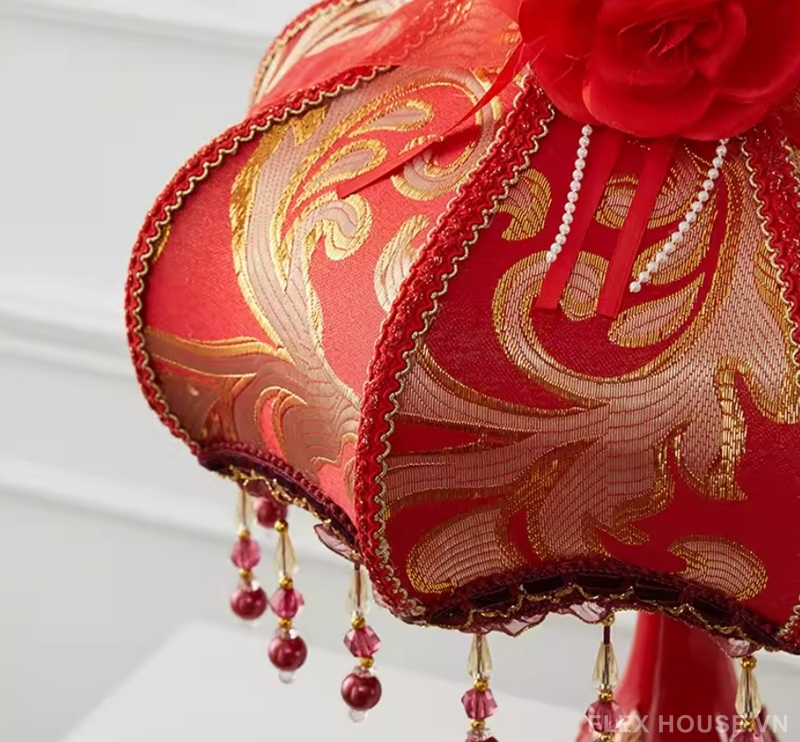 Ngay từ ánh nhìn đầu tiên, mẫu đèn bàn SRL9630 đã mang đến khí chất hỷ sự rõ rệt với gam đỏ chủ đạo – màu sắc tượng trưng cho may mắn, viên mãn và hạnh phúc bền lâu trong văn hóa cưới hỏi Á Đông. Thiết kế chao vải xếp múi mềm mại, họa tiết hoa văn ánh kim kết hợp tua hạt rủ tinh tế tạo nên cảm giác sang – ấm – đầy phúc khí, cực kỳ phù hợp cho phòng cưới, phòng tân hôn hoặc không gian chuẩn bị lễ gia tiên.